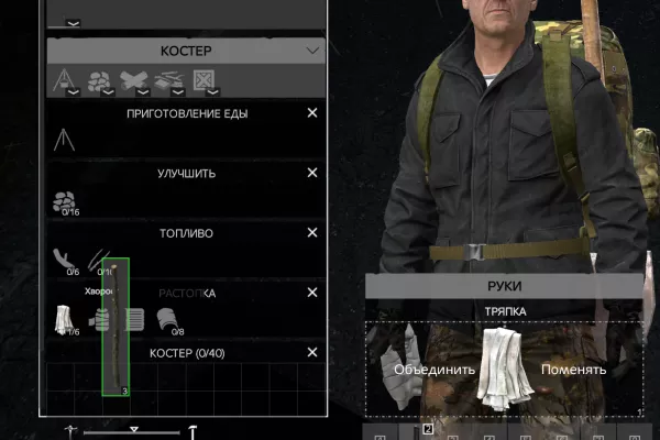 Чтобы развести огонь, нужно добавить в костер розжиг. Переместите бинты, древесную кору, карнавальную маску или тряпки бумагу в раздел «Растопка» в интерфейсе костра.