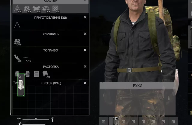 Чтобы костер горел продолжительно, вам понадобится топливо. Переместите дрова или короткие палки в раздел «Топливо» в интерфейсе костра.